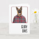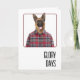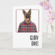 A German Shepherd is wearing glasses and a plaid shirt, set against a thin red frame on a white background.