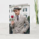 En snyggt man i ett beige kostym och fedora håller ett röd ros medan han står bredvid ett vintage bil med ett lyxhus i bakgrunden. Inomliggande meddelande kan ändras.