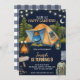 Birthday invitation featuring a camping theme. A tent sits under string lights with a crescent moon and pine trees. Text reads "Calling all happy campers! Joseph is turning 8." A campfire and lantern add warmth.