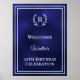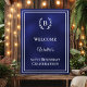 Navy blue, uneven colored background. Decorated with a wreath and space for your monogram letter. White colored frames, wreath and text. Personalize and add your name and age.