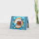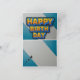 Ett festligt födelsedagskort med en klassisk födelsedagskalas med färgstark frost och tända ljus. Fem briljanta ballonger i färgad med krämande rosett band flyter ovanför tårtan. Bakgrunden är ett tydligt blå himmel. På kortets insida finns en blå bakgrund med texten "GRATTIS PÅ FÖDELSEDAGEN" i ett blockteckensnitt.