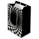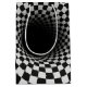A tunnel-like optical illusion is created using a black and white checkered pattern, giving a dizzying sense of depth.