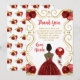 This birthday thank you card features an elegant gold frame, a beautiful princess with dark skin and a red dress, flowers and a balloon. This is perfect for a birthday party