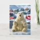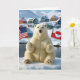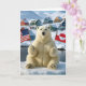 A polar bear perches on a small ice floe, proudly holding the flags of the United States and Greenland, with vibrant houses dotting the snowy background.