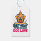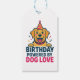 A cheerful birthday illustration featuring a happy golden retriever wearing a festive party hat with an excited, joyful expression. The playful cartoon style, bright colors, and bold lettering create a lively celebration vibe that dog lovers instantly connect with. This fun design captures the idea that birthdays are better when powered by dog love, happiness, and positive energy.
