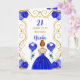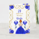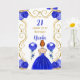 Den här inbjudan till födelsedagskort innehåller en elegant guld ram, en vacker prinsessa med rött hår och en royal blå klänning, blommor och ballong.