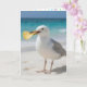 A seagull holds a potato chip in its beak while standing on a sandy beach, with the clear blue ocean creating a serene backdrop.