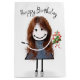 Cute stick figur flicka med hår och blombukett med smöret och en blå denim-klänning på vit bakgrund. Bakgrunden till färg kan ändras. Text kan redigeras.