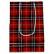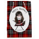 Cute stick-flicka med hår, röda glasögon, pärlhalsband och tartanklädd klänning på matchande tartan plaid mönster för alla åldrar. Text kan redigeras.