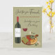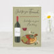 This is a birthday card for a friend with wine, charcuterie board including cheese, crackers, fruit and candy. The background is a linen soft green and the text, ‘Just for you Friend, Indulge on your Birthday.’