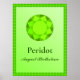 Poster i en digital illustration av en peridot gemstone, födelsesten för augusti, skalade kalkgröna, intill en peridot kristallkristaller mönster