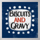 En rolig och söt typografisk sydstatsmatdesign som säger "Biscuits And Gravy". Den har svart och röd text på en vit rektangel med roliga, lekfulla vita prickar runt omkring, allt på en blå bakgrund.