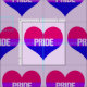 Härligt bisexuellt tyg som presenterar flagga för bisexualityprideregnbåge av rosor, lilor och blått på ett nätt mönster av biflickahjärtor. Gör dina egna kläder, gardiner eller mer för att visa av din sexualitetpride!