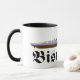Mugg med teckning av det berömda tyska slagskeppet Bismarck från andra världskriget med fartygets namn skrivet med fraktur-bokstäver.