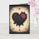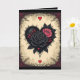 Ett djärvt, gotiskt, bläcksvart hjärta kantat med en delikat trimning. Inuti hjärtat finns två rosor. Små röda knoppar och mörka blad sprider sig runt dem och skapar en dramatisk kontrast till kronbladens mjukhet. Den övergripande stämningen är rikligt romantisk med en mörk, bittersöt kant. En utsmyckad ram inramar allt: krullande vinrankor, taggiga filigraner och symmetriska hörndekorationer i djuprött och svart som känns både dekorativa och lite hotfulla. Små röda hjärtan pryder designen ovanför och nedanför det centrala motivet.