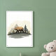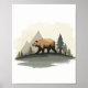 Denna illustration visar en brunbjörn som går längs en ås med berg i bakgrunden och stiliserade träd. De mjuka färgerna och enkla formerna frammanar en känsla av fred och lugn i naturen.