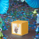 Björn i brunkolssötare med Gult Balloon Presentaskar