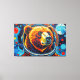 Denna slående konstverk av Otis Porritt framställer en björn i en astronauthjälm, med en direkt och fängslande blick. Djurets päls framställs med en rik textur av penseldrag i varma orange, gula och bruna nyanser, vilket skapar en livfull, nästan impasto-effekt. Kalla blå och lila nyanser definierar nosen och kontrasterar mot pälsens eldiga toner. Hjälmens reflekterande visir inramar björnens ansikte, medan bakgrunden virvlar med dynamiska penseldrag i teal och djupblått, som frammanar en kosmisk vidd. Det digitala mediet fångar på ett mästerligt sätt en målerisk estetik.