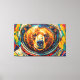 Detta slående konstverk av Otis Porritt framställer en björn i en astronauthjälm, med en direkt och fängslande blick. Djurets päls framställs med en rik textur av penseldrag i varma orange, gula och bruna nyanser, vilket skapar en livfull, nästan impasto-effekt. Kalla blå och lila nyanser definierar nosen och kontrasterar mot pälsens eldiga toner. Hjälmens reflekterande visir inramar björnens ansikte, medan bakgrunden virvlar med dynamiska penseldrag i teal och djupblått, som frammanar en kosmisk vidd. Det digitala mediet fångar på ett mästerligt sätt en målerisk estetik.