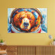 Detta slående konstverk av Otis Porritt framställer en björn i en astronauthjälm, med en direkt och fängslande blick. Djurets päls framställs med en rik textur av penseldrag i varma orange, gula och bruna nyanser, vilket skapar en levande, nästan impasto-effekt. Kalla blå och lila nyanser definierar nosen och kontrasterar mot pälsens eldiga toner. Hjälmens reflekterande visir inramar björnens ansikte, medan bakgrunden virvlar med dynamiska penseldrag i teal och djupblått, som frammanar en kosmisk vidd. Det digitala mediet fångar på ett mästerligt sätt en målerisk estetik.