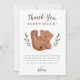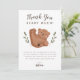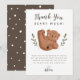 Rolig björnt tema barn födelsedagsfest tackkort med illustration av en björnunge som rullar på rygg med gröna blad på sidorna. Meddelandet tackar gästerna för att de kom till festen. Texten högst upp säger "Tack så björnigt mycket!". Perfekt för ditt barns skogstema party.