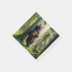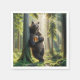 En björn står bara mot en träd som håller en mugg öl med tass i en solbelyst skog