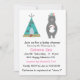 Modigare lilla björn unge med stamhuvudväxel och med buggben och pil och ett färg-teal med mönster designade babyduschkort. Du kan enkelt redigera och ändra bakgrundsinformationen för färg, namn och party.