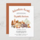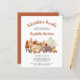 Klar budgetvänlig rustik, hösttematisk barnduschinbjudan med en vattenfärgad illustration av trädsdjur med tält-camping i bergen och skogen, fall och vaxar. "Äventyr Awaits" och "mor to be's namn" är skrivna i ett terracotta-manus.