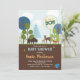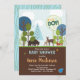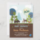 En färgstark inbjudan till babydusch i skogsområden med skogsdjur och färgat träd med en skyddad bakgrund av träkorn.
