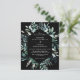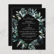 Den här budgeten, botaniska lövbordsinbjudningar - innehåller vit handskriven text och skript i elegant, med leafy ram, rustik vit snopp på den svarta bakgrunden. Den omvända sidan av inbjudan är laktatsvart.