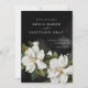En inbjudan till Elegant bröllop designad med en vit Magnolia-illustration på svart bakgrund. Kortets baksida kan anpassas med ditt favoritfoto med porträtt. Matcha objekt i vår butik Cava Party Design