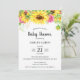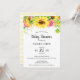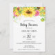 Baby Shower-inbjudan med solblommor i gult, rosa och grönt på vit bakgrund. Baksidan av inbjudan har en lätt gult vattenfärg rand mönster.