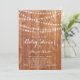 Finare-ribbonskript och mousserande sträng ljus dekorerar denna babyduschinbjudan på en lätt träbakgrund, skapar den perfekt för den rustiska, land, westerna eller traditionella babyduschen som accentueras med sträng ljus.