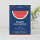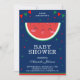Sug upp dina gäster med den här söta babyduschen inbjudan med ett fint vattenmelonsegment med vibrerande inslag mot blå bakgrund. Lägg bara till din händelseinformation i den här mallen som är enkel att använda för att göra den till en inbjudan av typen en. Vänd över kortet för att visa en röd och vit elegant rand mönster på baksidan av kortet.