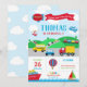Vibrant Transport-inbjudningskort med färgbilar, lastbilar, buss, fraktaser, båtar, flygplan, helikoptrar och allt sak som rör sig. Anpassa inbjudan till Transport i fantastisk med information om ditt barns namn, ålder och party enkelt och snabbt, tryck helt enkelt på anpassningsknappen för att ytterligare ordna om och formatera stil och placera texten. Innehåller en matchning av inbjudan-design. (c) Det finns etiketter till vattenflaskan Lycklig Cat Studio Matching. https://www.zazzle.com.au/transportation_birthday_party_water_bottle_labels-256915769913404832 Matching-välkomstskylt https://www.zazzle.com.au/transportation_birthday_party_welcome_sign_poster-228407633785042004