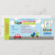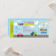 Cute transport biljett stil födelsedag med bilar, flygplan, lastbilar, tåg.