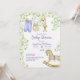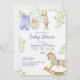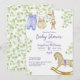 En inbjudan till babydusch med en arrangemang söta barnkläder som hänger för att torka på en linje, en söt stuffad bunny, en ärekränkande häst grund på kortet, och alla dessa föremål omges av delikat grenar med ljust grönt löv.