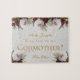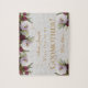 Det finns burgunderröda och vita peonior på den övre kanten och i de nedre hörnen. Bakgrunden är vit marmor, texten är gyllene. De första och sista raderna, med namnen, är skrivna i ett elegant kalligrafiskt typsnitt, meddelandet "Vill du vara min gudmor?" är i versaler.