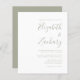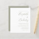 Den här enkla, moderna bröllopsinbjudan innehåller grönt på vit bakgrund. Lägg till bildens och bildens namn i snyggtens handskriftsgrafi och detaljerna i sans serif-teckensnitt. På baksidan finns utrymme för information om bröllop på en solid sage grönt-bakgrund, tillsammans med en QR-kodgäst som kan söka på webbplatsen och OSAN.