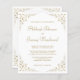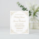 Den här vintage-inspirerade formella bröllopsinbjudan innehåller texten i guld färgad-skript och serif typsnitt, framtagen av ett känsligt guld-motiv för vintage. Ram upprepas i motsatt riktning. På baksidan finns utrymme för information om bröllop, tillsammans med en QR-kodgäst som kan söka på webbplatsen och OSAN, vilket sparar kostnaderna för utskrift och utskick av separat OSA kort.