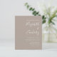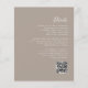 Den här enkla, moderna bröllopsinbjudan innehåller vit text på en neutraltens taupbakgrund. Lägg till bildens och bildens namn i snyggtens handskriftsgrafi och detaljerna i sans serif-teckensnitt. På baksidan finns utrymme för information om bröllop på en solid taupbakgrund, tillsammans med en QR-kodgäst som kan söka på webbplatsen och OSAN.