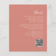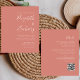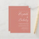 Den här enkla moderna bröllopsinbjudan innehåller vit text på en terracotta-bakgrund. Lägg till bildens och bildens namn i snyggtens handskriftsgrafi och detaljerna i sans serif-teckensnitt. På baksidan finns utrymme för information om bröllop, tillsammans med en QR-kodgäst som kan söka på webbplatsen och OSAN, vilket sparar kostnaderna för utskrift och utskick av separat OSA. Obs! Kuvert inkluderas inte automatiskt i dessa budgetinbjudningar, så kom ihåg att välja alternativet "vita kuvert"!