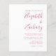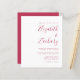 Den här enkla, moderna bröllopsinbjudan innehåller magentans rosa text på vit bakgrund. Lägg till bildens och bildens namn i snyggtens handskriftsgrafi och detaljerna i sans serif-teckensnitt. På baksidan finns utrymme för information om bröllop på en solid magenta-bakgrund, tillsammans med en QR-kodsgäst som kan söka efter webbplatsen och OSAN. Obs! Kuvert inkluderas inte automatiskt i dessa budgetinbjudningar, så kom ihåg att välja alternativet "vita kuvert"!