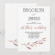 Bröllopsinbjudningar med ro-guld-folie ger blommor, löv och anpassningsbar, när bruden och brudgummen står på plats, tryckta på vit bakgrund