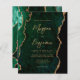 Den här inbjudan från elegant bröllop innehåller en bakgrundsbild av vattenfärgsagat i emerald grönt som trimmas med faux guld glitter. Anpassadet kombinerar modern handskrift, tryckplåt och kursivt typsnitt med guld-färgad. Den omvända sidan har en samordnande grönt och guld agate-design.