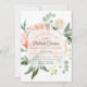 Vackra och ömtåliga babyduschinbjudningar med pastellhandsmålad vattenfärg ro, vattenskotor och peonier i persikor och grädde, accentuerade med grönt eucalyptus löv. Anpassa enkelt den här eleganten med information om babyduschen.