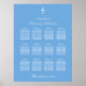 Blå 12 bord dopnamnssittningsdiagramaffisch, vänligen anpassa namnet på den som döps och namnen på gästerna tillsammans med eventuell annan text som du önskar anpassa. En stilren sittplaneringsaffisch med ett vitt kors och elegant vit text på en vacker mild blå bakgrund.