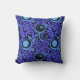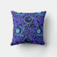 Modern kastkudde med abstrakt blommönster i olika nyanser av blått på svart bakgrund.