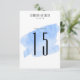 Ett modernt bröllopsbord nummer har blå akvarell tvätt bakgrund.