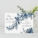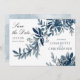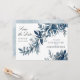 Intressant, modern och elegant bröllopsinbjudan med blå indigo-blommor och blad i akvarell. Löst målade blommor med konturer. Ett unikt kort med horisontell design. Färgskalan gör kortet lämpligt för ett vinterbröllop.